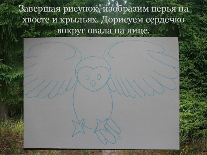 Слайд 9Завершая рисунок, изобразим перья на хвосте и крыльях. Дорисуем сердечко вокруг