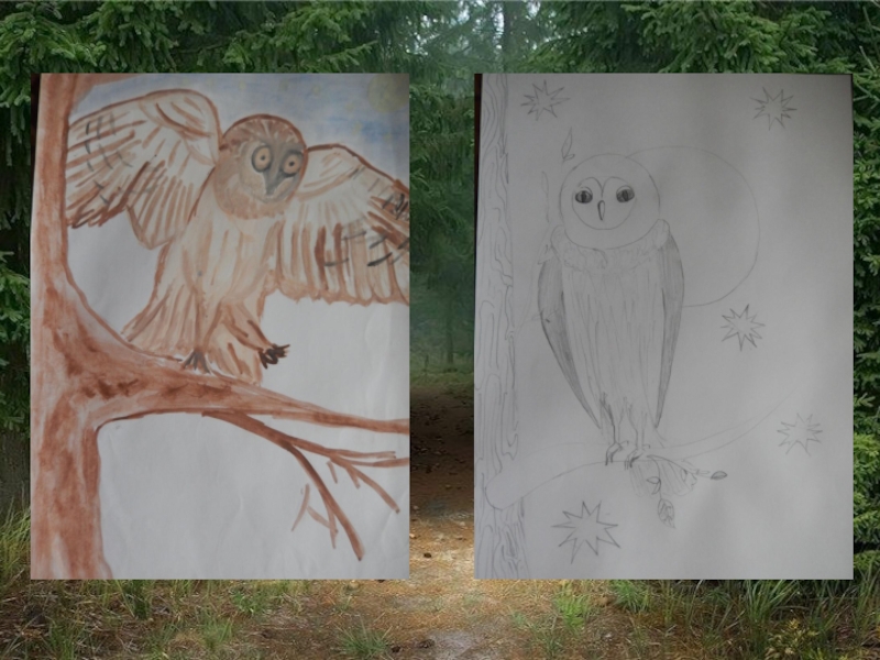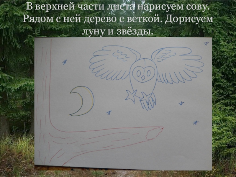 Слайд 10В верхней части листа нарисуем сову. Рядом с ней дерево с