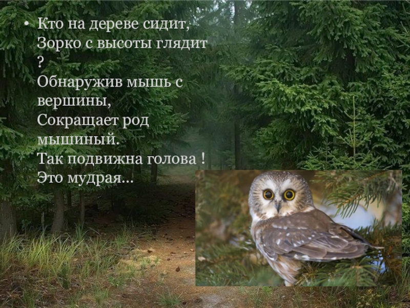 Слайд 2Кто на дереве сидит, Зорко с высоты глядит ? Обнаружив мышь с вершины, Сокращает