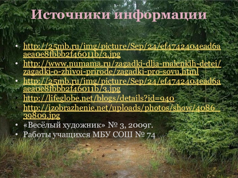 Источники информации http://25mb.ru/img/picture/Sep/24/ef4742404ead6aaea0e8fbbb2f46011b/3.jpghttp://www.numama.ru/zagadki-dlja-malenkih-detei/zagadki-o-zhivoi-prirode/zagadki-pro-sovu.htmlhttp://25mb.ru/img/picture/Sep/24/ef4742404ead6aaea0e8fbbb2f46011b/3.jpghttp://lifeglobe.net/blogs/details?id=940http://izobrazhenie.net/uploads/photos/show/4086_39809.jpg«Весёлый художник» № 3, 2009г.Работы учащихся МБУ СОШ № 74