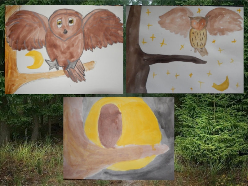 В верхней части листа нарисуем сову. Рядом с ней дерево с веткой. Дорисуем луну и звёзды.