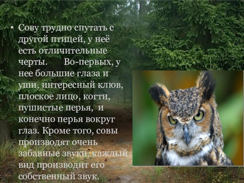 Слайд 4Сову трудно спутать с другой птицей, у неё есть отличительные черты.