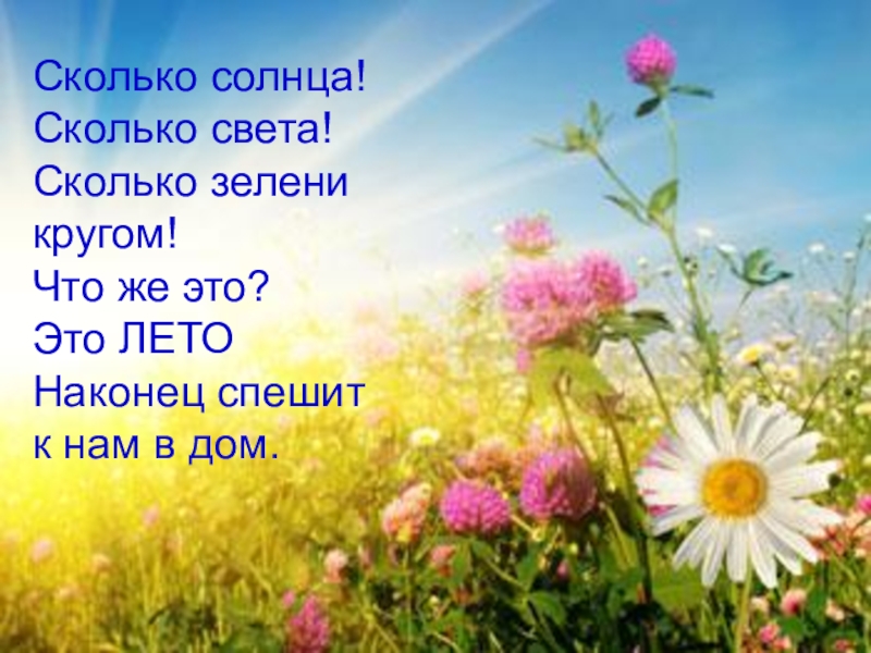 Сколько солнца! Сколько света!  Сколько зелени кругом!  Что же это? Это ЛЕТО  Наконец спешит к нам в дом.