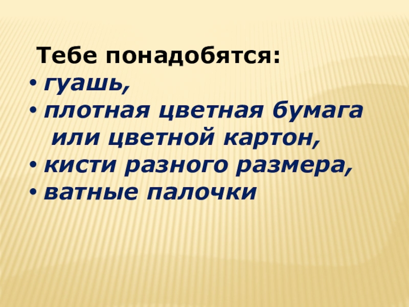 Тебе понадобятся: гуашь, плотная цветная бумага  или цветной картон, кисти разного размера, ватные палочки