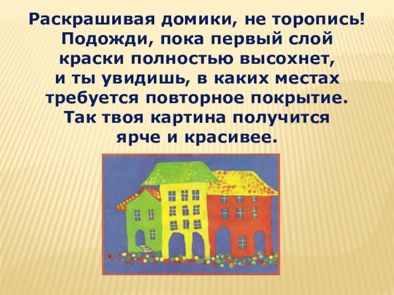 Раскрашивая домики, не торопись! Подожди, пока первый слой краски полностью высохнет, и ты увидишь, в каких местах