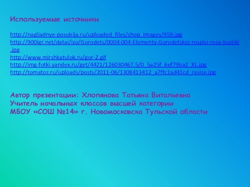 Используемые источникиhttp://nagljadnye-posobija.ru/uploaded_files/shop_images/959.jpghttp://900igr.net/datai/izo/Gorodets/0004-004-Elementy-Gorodetskoj-rospisi-roza-kustiki.jpghttp://www.mirshkatulok.ru/gor-2.gifhttp://img-fotki.yandex.ru/get/4421/126030467.5/0_5a25f_6ef79ba2_XL.jpghttp://tomatoz.ru/uploads/posts/2011-06/1308413412_a7ffc1ad41cd_resize.jpgАвтор презентации: Хлопянова Татьяна ВитальевнаУчитель начальных классов высшей категорииМБОУ «СОШ №14» г. Новомосковска Тульской области