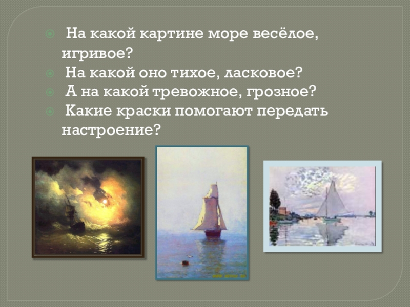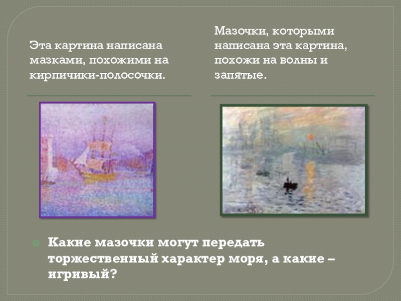 Какие мазочки могут передать торжественный характер моря, а какие – игривый?