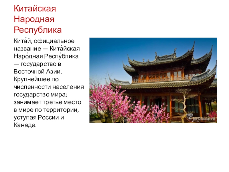 Китайская Народная РеспубликаКита́й, официальное название — Кита́йская Наро́дная Респу́блика — государство в Восточной Азии. Крупнейшее по численности