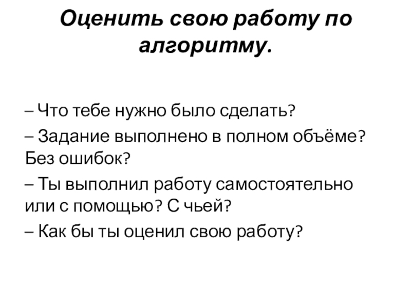 Оценить свою работу по алгоритму.  – Что тебе нужно было сделать?– Задание выполнено в полном объёме? Без
