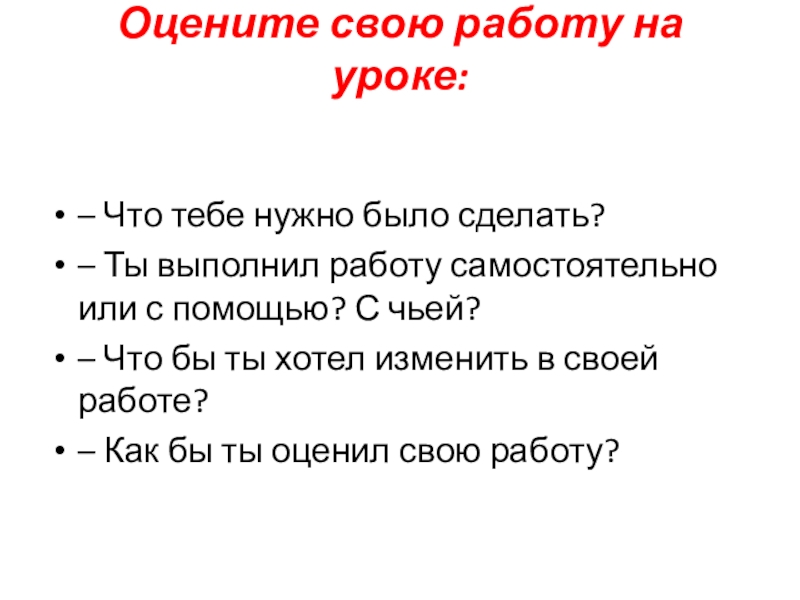 Оцените свою работу на уроке: – Что тебе нужно было сделать?– Ты выполнил работу самостоятельно или с