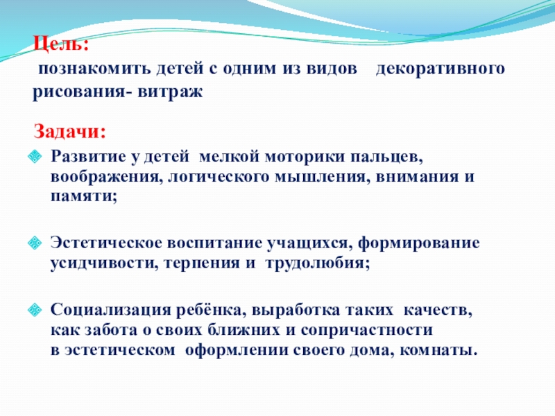 Эстетическое воспитание учащихся, формирование усидчивости, терпения и трудолюбия;