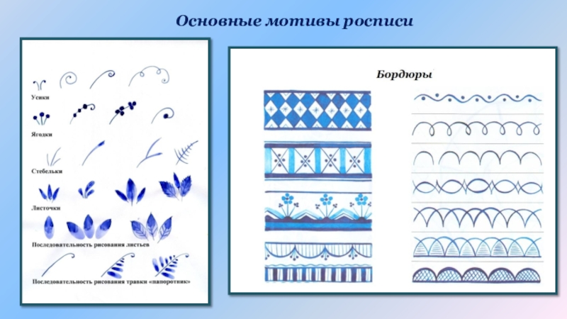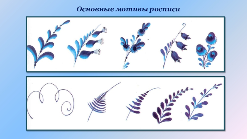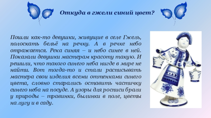 полоскать бельё на речку. А в речке небо отражается. Река синяя – и небо синее в ней. Показали девушки мастерам красоту такую. И решили, что такого синего неба нигде в мире не найти. Вот тогда-то и стали расписывать мастера свои изделия всеми оттенками синего цвета, словно старались оставить частичку синего неба на посуде. А узоры для росписи брали у природы – травинки, былинки в поле, цветы на лугу и в саду.