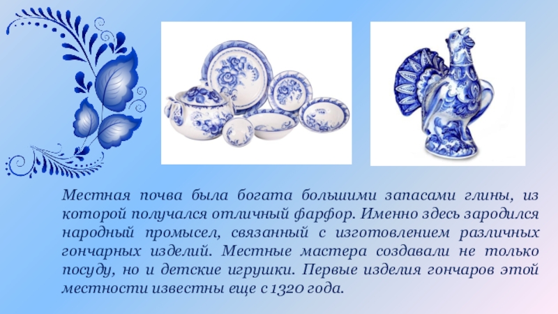 Местная почва была богата большими запасами глины, из которой получался отличный фарфор. Именно здесь зародился народный промысел,