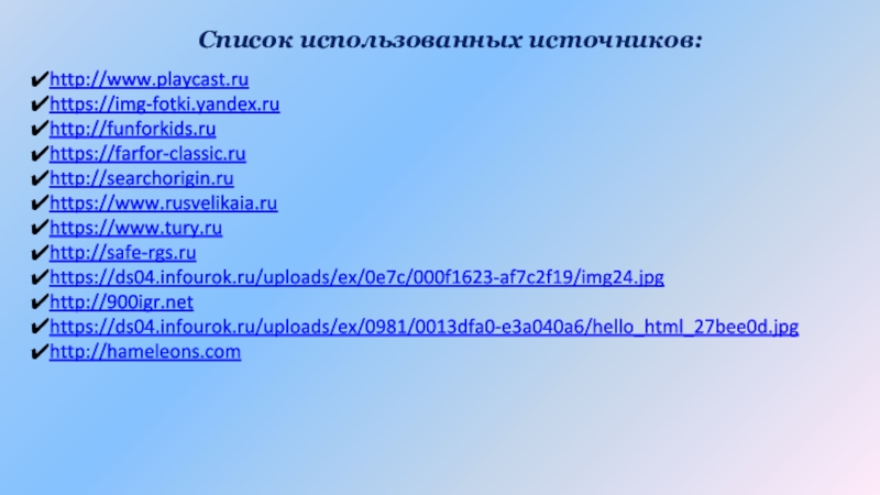 Список использованных источников:http://www.playcast.ruhttps://img-fotki.yandex.ruhttp://funforkids.ruhttps://farfor-classic.ru http://searchorigin.ru https://www.rusvelikaia.ruhttps://www.tury.ruhttp://safe-rgs.ru https://ds04.infourok.ru/uploads/ex/0e7c/000f1623-af7c2f19/img24.jpghttp://900igr.nethttps://ds04.infourok.ru/uploads/ex/0981/0013dfa0-e3a040a6/hello_html_27bee0d.jpghttp://hameleons.com