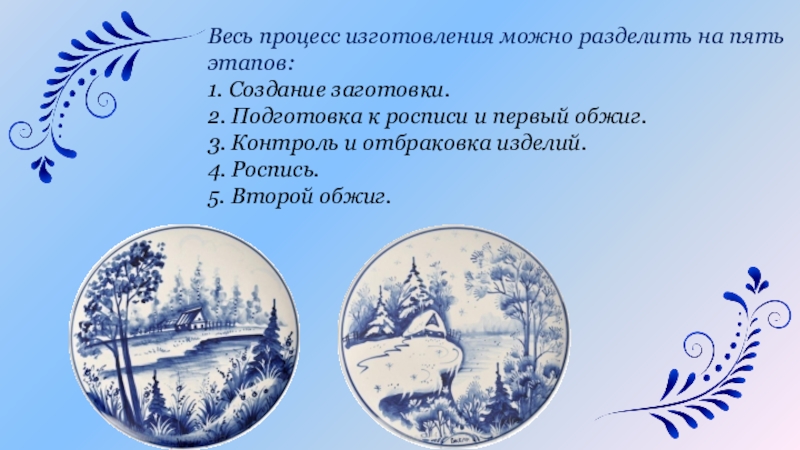 Весь процесс изготовления можно разделить на пять этапов:1. Создание заготовки. 2. Подготовка к росписи и первый обжиг.