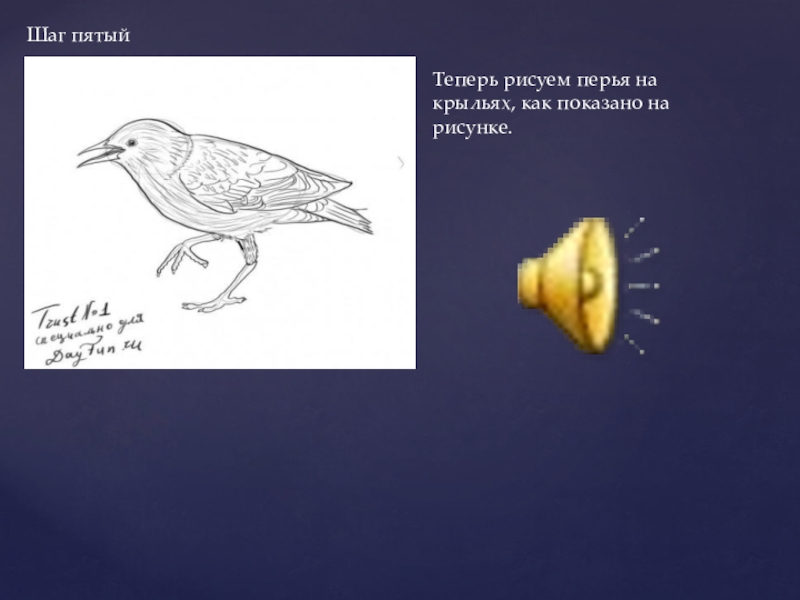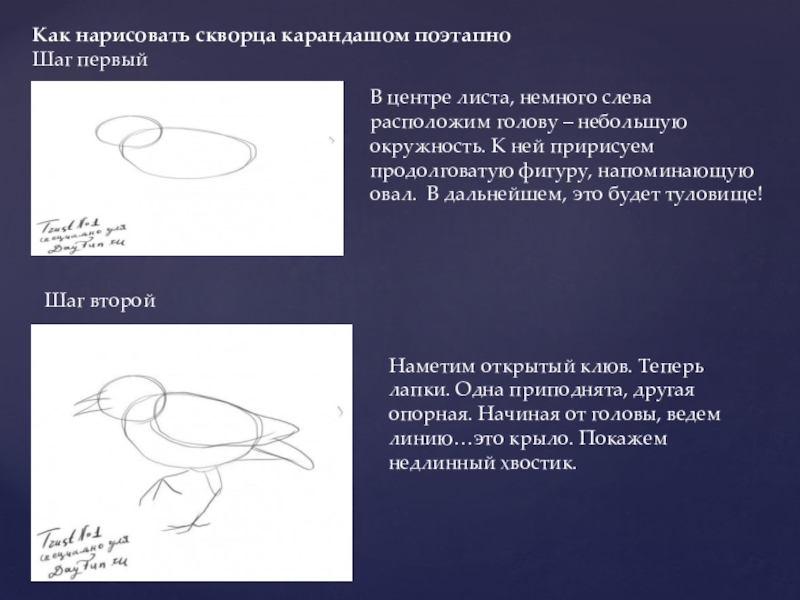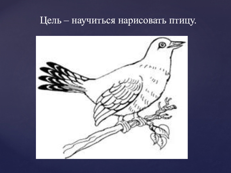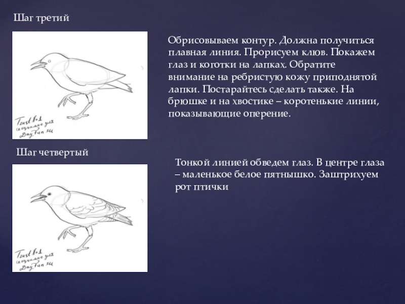 Наметим открытый клюв. Теперь лапки. Одна приподнята, другая опорная. Начиная от головы, ведем линию…это крыло. Покажем недлинный хвостик.