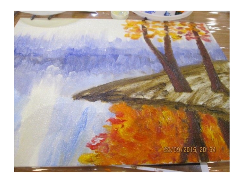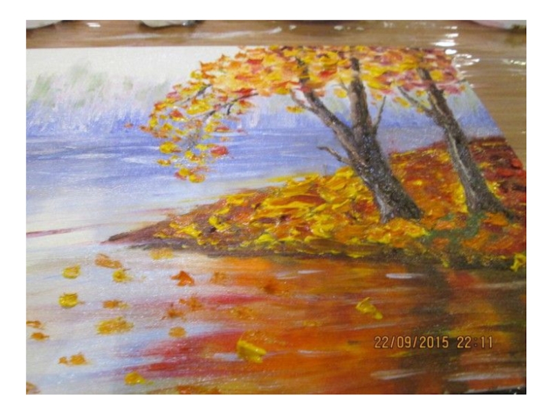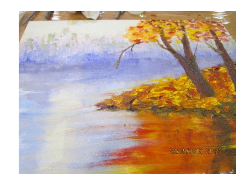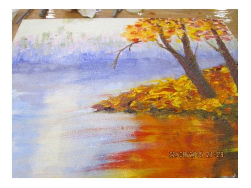 листва заиграла необходимо при нанесении последних штрихов нанести поверх листвы очень бледно-желтые пятна. И тогда в картине появится глубина