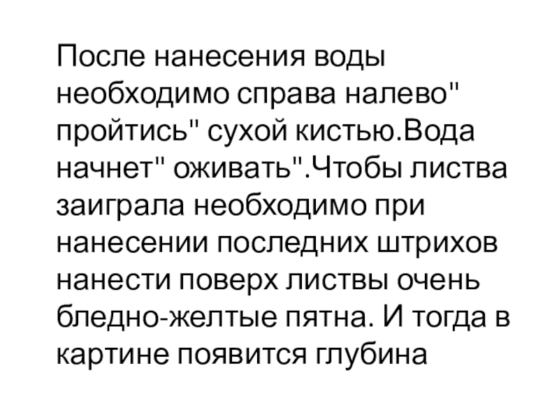 Слайд 11После нанесения воды необходимо справа налево" пройтись" сухой кистью.Вода начнет" оживать".Чтобы