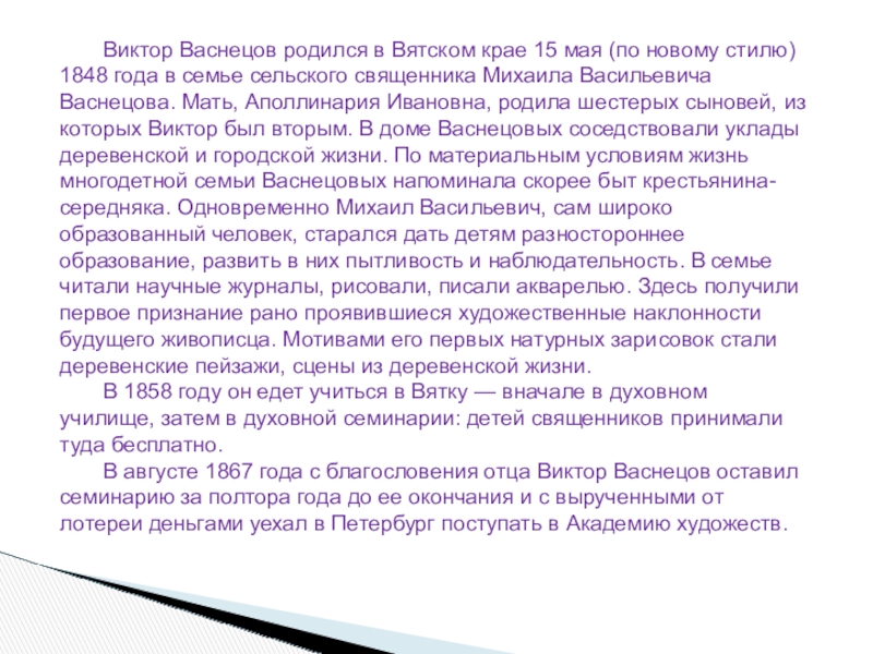 Слайд 2 Виктор Васнецов родился в Вятском крае 15 мая (по новому стилю)