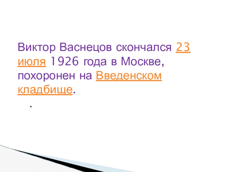Слайд 11Виктор Васнецов скончался 23 июля 1926 года в Москве, похоронен на Введенском кладбище. .
