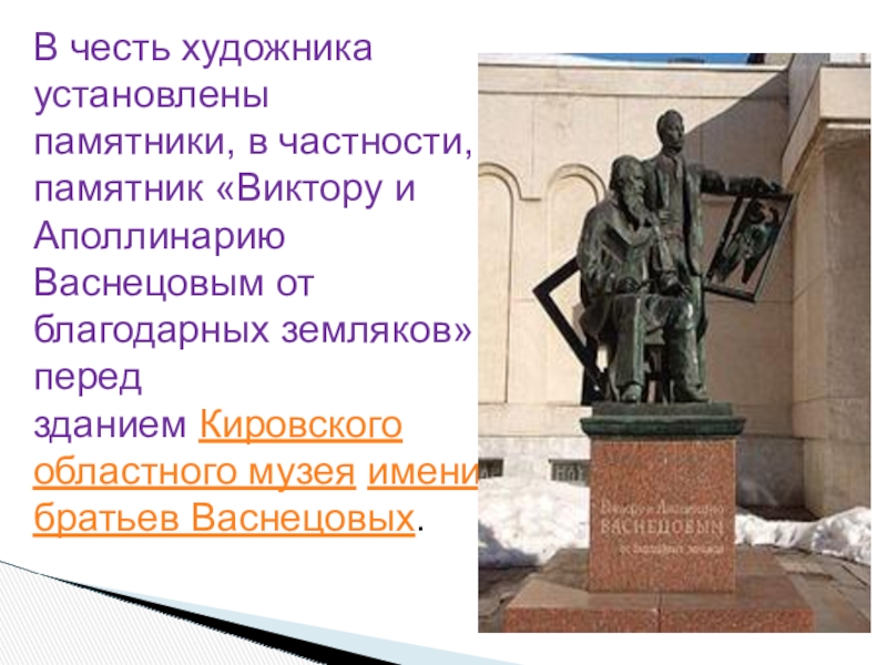Васнецовым от благодарных земляков» перед зданием Кировского областного музея имени братьев Васнецовых.