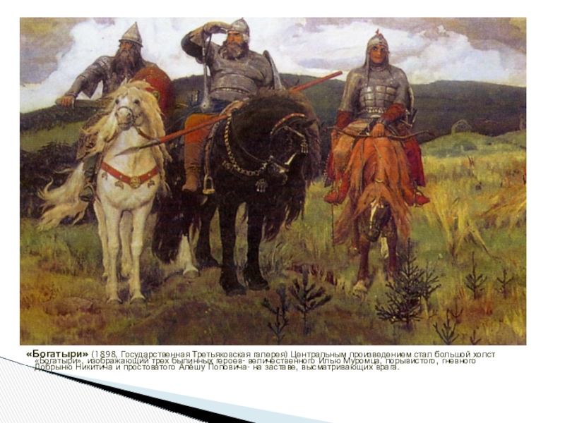 «Богатыри» (1898, Государственная Третьяковская галерея) Центральным произведением стал большой холст «Богатыри», изображающий трех былинных