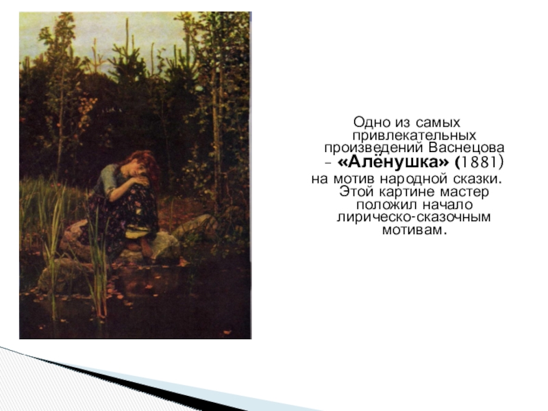 Одно из самых привлекательных произведений Васнецова – «Алёнушка» (1881)на мотив народной сказки. Этой картине мастер положил начало