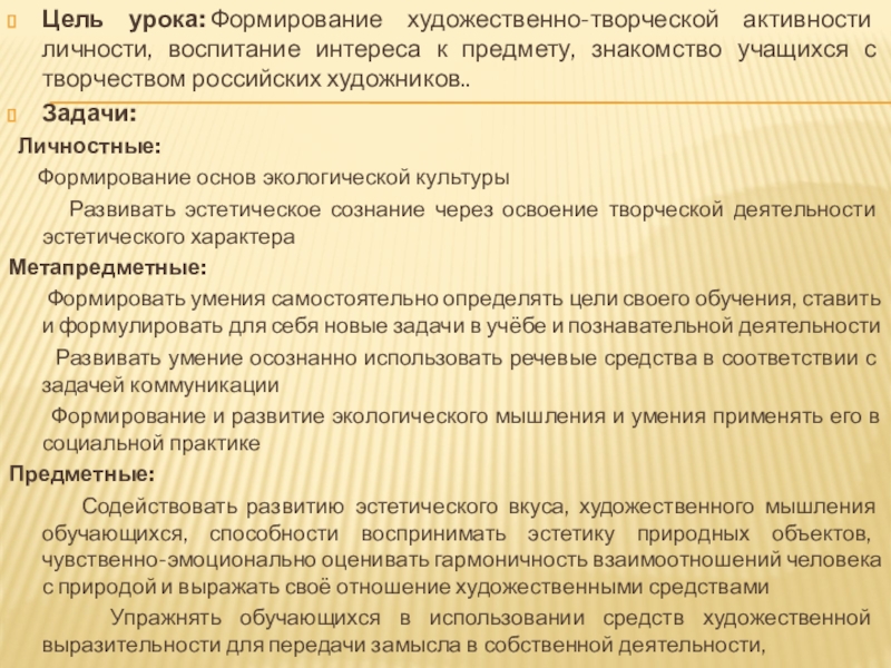 Слайд 2Цель урока: Формирование художественно-творческой активности личности, воспитание интереса к предмету, знакомство учащихся