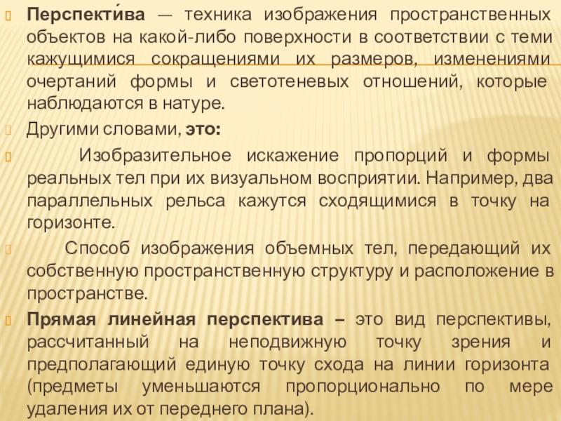 Слайд 15Перспекти́ва — техника изображения пространственных объектов на какой-либо поверхности в соответствии