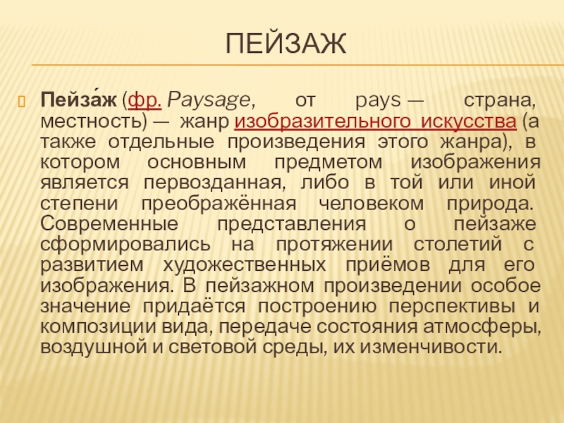жанра), в котором основным предметом изображения является первозданная, либо в той или иной степени преображённая человеком природа. Современные представления о пейзаже сформировались на протяжении столетий с развитием художественных приёмов для его изображения. В пейзажном произведении особое значение придаётся построению перспективы и композиции вида, передаче состояния атмосферы, воздушной и световой среды, их изменчивости.
