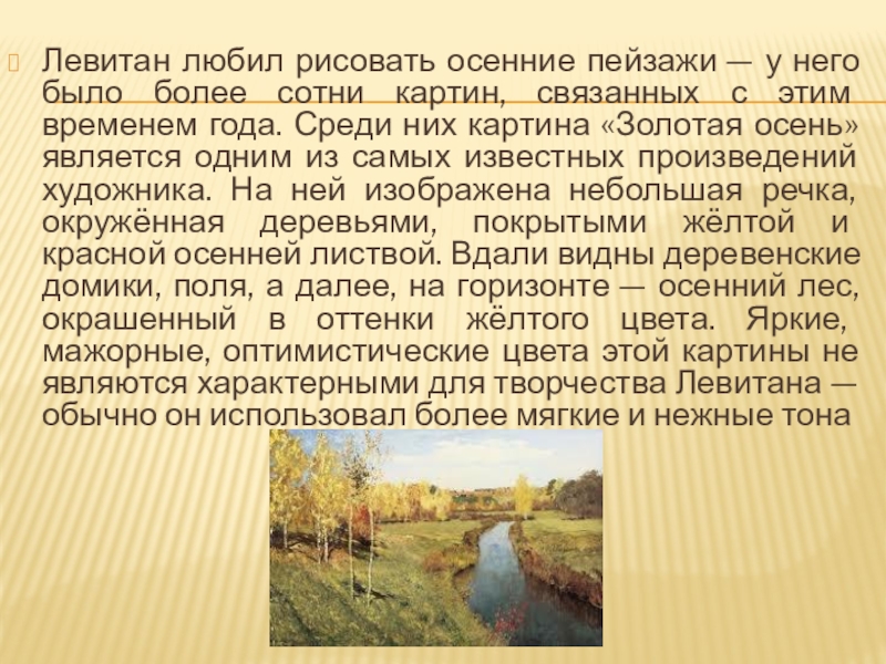 связанных с этим временем года. Среди них картина «Золотая осень» является одним из самых известных произведений художника. На ней изображена небольшая речка, окружённая деревьями, покрытыми жёлтой и красной осенней листвой. Вдали видны деревенские домики, поля, а далее, на горизонте — осенний лес, окрашенный в оттенки жёлтого цвета. Яркие, мажорные, оптимистические цвета этой картины не являются характерными для творчества Левитана — обычно он использовал более мягкие и нежные тона