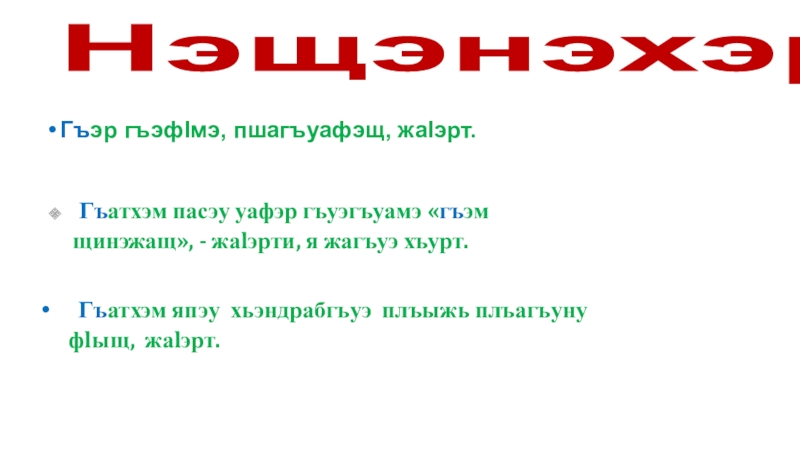 Гъатхэм япэу хьэндрабгъуэ плъыжь плъагъуну фlыщ, жаlэрт.