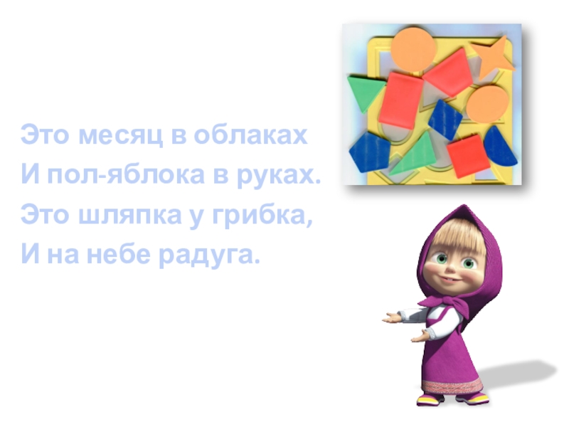 Это месяц в облакахИ пол-яблока в руках.Это шляпка у грибка,И на небе радуга.