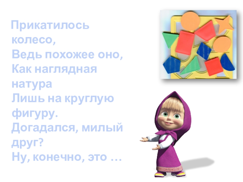 Слайд 7 Прикатилось колесо, Ведь похожее оно, Как наглядная натура Лишь на круглую фигуру. Догадался,