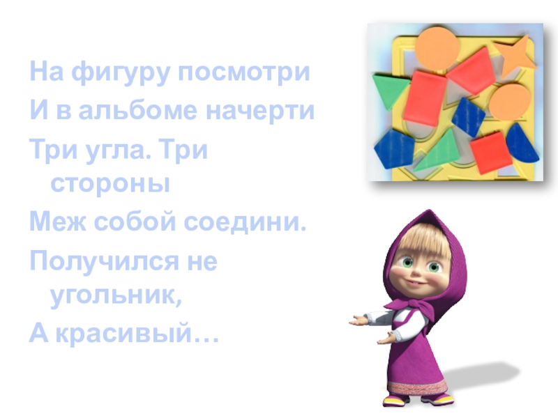 На фигуру посмотриИ в альбоме начерти Три угла. Три стороныМеж собой соедини.Получился не угольник,А красивый…