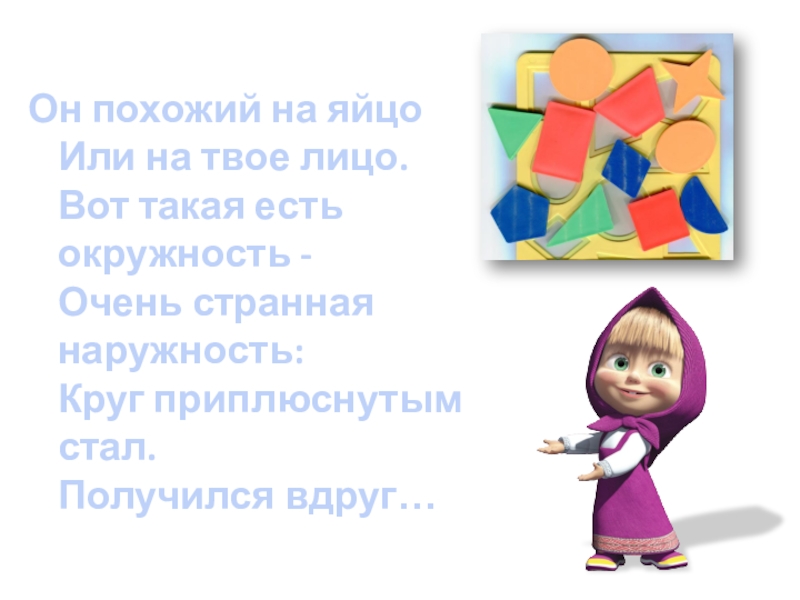 Он похожий на яйцо Или на твое лицо. Вот такая есть окружность -  Очень странная наружность: Круг