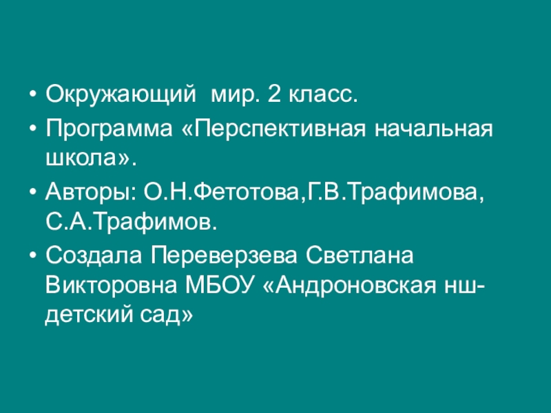 Окружающий мир. 2 класс.Программа «Перспективная начальная школа». Авторы: О.Н.Фетотова,Г.В.Трафимова,С.А.Трафимов.Создала Переверзева Светлана Викторовна МБОУ «Андроновская нш-детский сад»