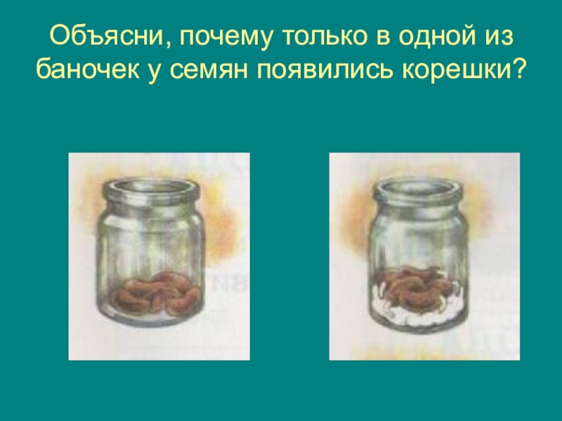 Слайд 2Объясни, почему только в одной из баночек у семян появились корешки?