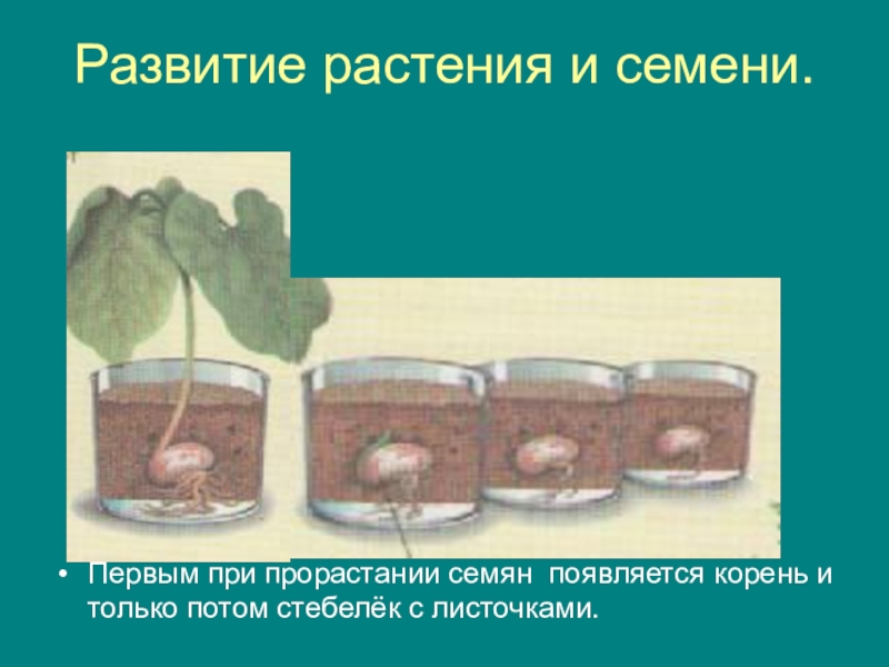 Развитие растения и семени.Первым при прорастании семян появляется корень и только потом стебелёк с листочками.