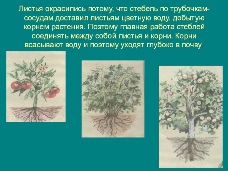 Слайд 10Листья окрасились потому, что стебель по трубочкам-сосудам доставил листьям цветную воду,