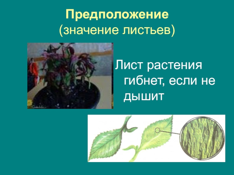 Предположение  (значение листьев)Лист растения гибнет, если не дышит