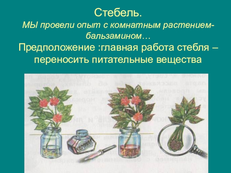 Слайд 9 Стебель. МЫ провели опыт с комнатным растением- бальзамином… Предположение :главная работа стебля –переносить