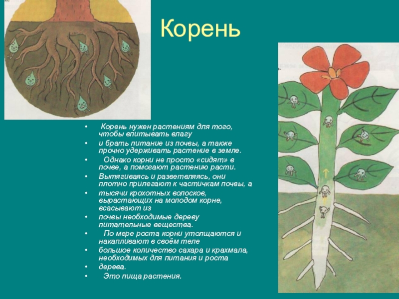 Корень Корень нужен растениям для того, чтобы впитывать влагу и брать питание из почвы, а также прочно