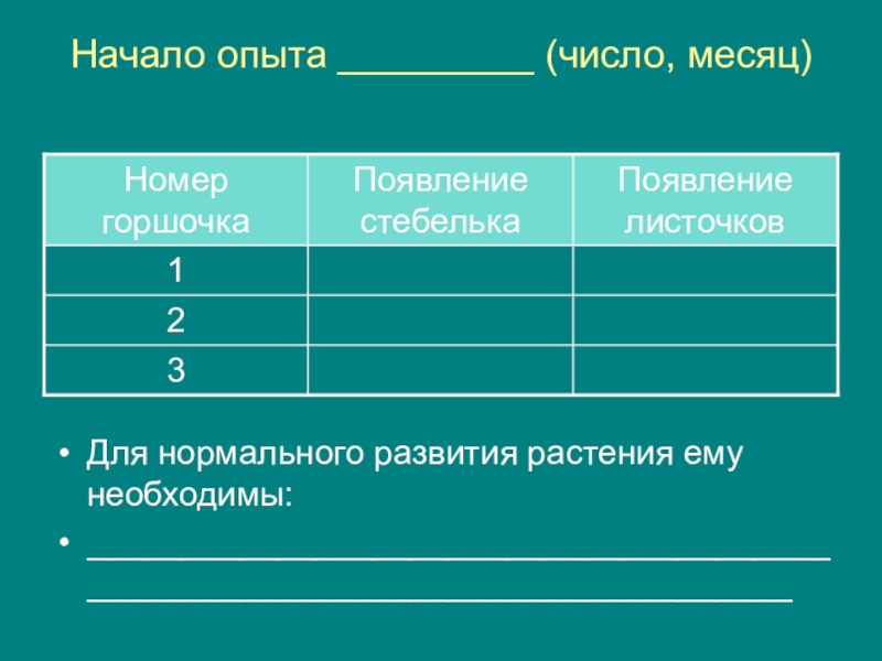 Начало опыта _________ (число, месяц)Для нормального развития растения ему необходимы:____________________________________________________________________________