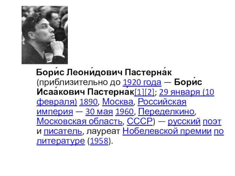 Слайд 16 Бори́с Леони́дович Пастерна́к (приблизительно до 1920 года — Бори́с