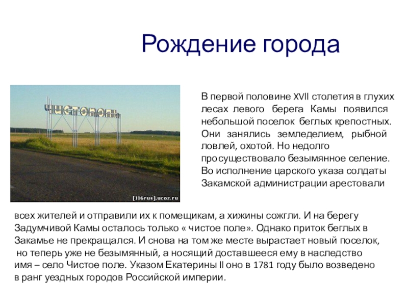 имя – село Чистое поле. Указом Екатерины ll оно в 1781 году было возведено
