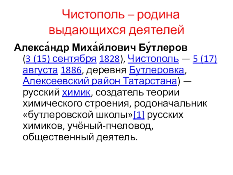 Чистополь — 5 (17) августа 1886, деревня Бутлеровка, Алексеевский район Татарстана) — русский химик, создатель теории химического строения, родоначальник «бутлеровской школы»[1] русских химиков, учёный-пчеловод, общественный деятель.