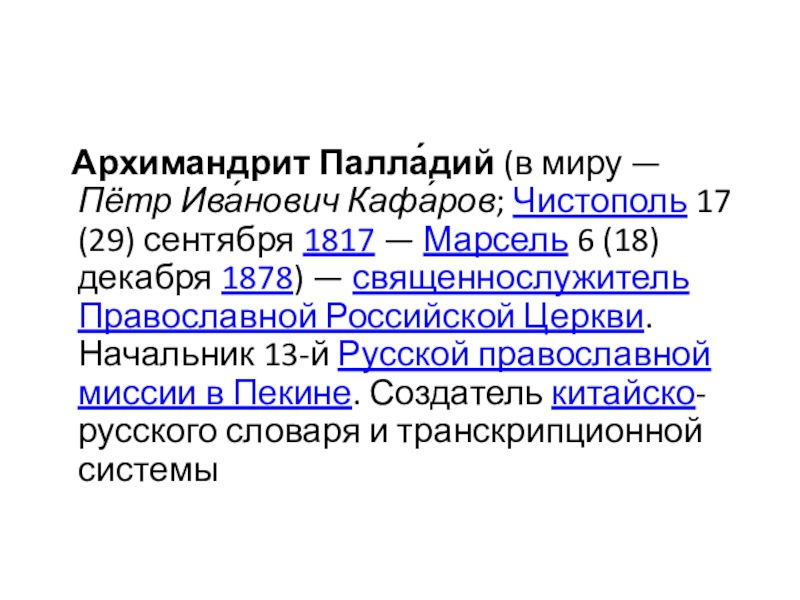 Слайд 17 Архимандрит Палла́дий (в миру — Пётр Ива́нович Кафа́ров; Чистополь 17