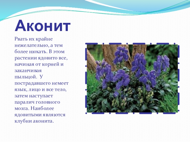 АконитРвать их крайне нежелательно, а тем более нюхать. В этом растении ядовито все, начиная от корней и