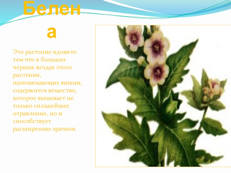 БеленаЭто растение ядовито тем что в больших черных ягодах этого растения, напоминающих вишни, содержится вещество, которое вызывает